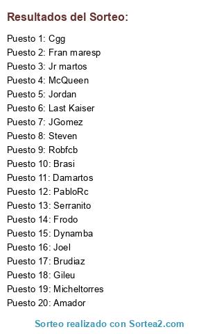 Lista de participantes: Fran maresp, Serranito, Micheltorres, Amador, Damartos, PabloRc, Robfcb, McQueen, Joel, Jr martos, Cgg, JGomez, Brasi, Gileu, Dynamba, Frodo, Jordan, Brudiaz, Last Kaiser, Steven.
