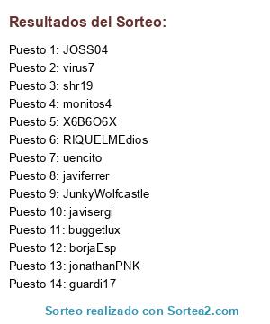 Lista de participantes: shr19, monitos4, X6B6O6X, virus7, jonathanPNK , javiferrer, guardi17, borjaEsp, javisergi, uencito, JunkyWolfcastle, RIQUELMEdios , buggetlux , JOSS04.