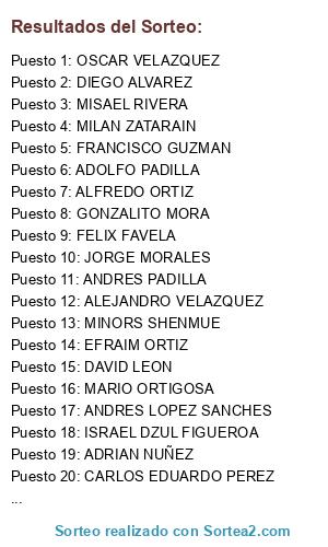 Lista de participantes: MARIO ORTIGOSA, DIEGO ALVAREZ, ALFREDO ORTIZ, JOSE ALBERTO HERNANDEZ, ANDRES PADILLA, CARLOS EDUARDO PEREZ, MISAEL RIVERA, ADOLFO PADILLA, ANDRES LOPEZ SANCHES, OSCAR VELAZQUEZ, DAVID LEON, ALEJANDRO VELAZQUEZ, FRANCISCO GUZMAN, OMAR BARRERAS HERNANDEZ, GUAYABO LAZ, GONZALITO MORA, AVENTURE TIME, JORGE MORALES, FELIX FAVELA, EFRAIM ORTIZ, MINORS SHENMUE, MILAN ZATARAIN, ISRAEL DZUL FIGUEROA, ADRIAN NUÑEZ.