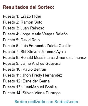 Lista de participantes: Ronald Messimania Jiménez Jimenez, Paulo Beltran, Esneider Bernal, Ramon Soto, Erazo Hider, Luis Fernando Zuleta Castillo, Stiven Viana Durango, Juan Reinoso, Jaime Andres Guevara, Jorge Mario Vargas Beleño, JuanManuel Bonilla, Stif Steven Jimenez Ayala, Jhon Fredy Hernandez, David Rojo.