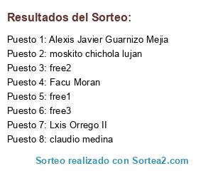 Lista de participantes: moskito chichola lujan, claudio medina, Facu Moran, Alexis Javier Guarnizo Mejia, Lxis Orrego II, free1, free2, free3.