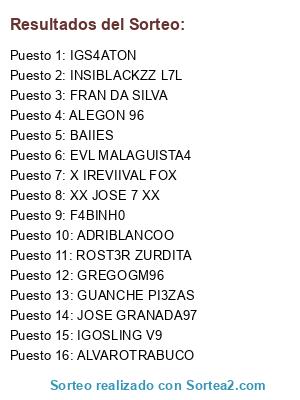 Lista de participantes: JOSE GRANADA97, I5I ZIDANE 10, IGOSLING V9, EL RENEGADO95, XXXVALIENTEXXX, GUANCHE PI3ZAS, SR PISTOLAS 86, IRANDY V8, INSIBLACKZZ L7L, JESUPANTUFLA35, O0 SERGI 0O, AARONRJ24, IVAN L 96 LX, ALEGON 96, CARLOSBD9, X IREVIIVAL FOX, L IMAAGIIK L, FRAN DA SILVA, KUALITY100, SPIFFIESTJOSE, ALEXFCBARCELONA, TORRES1992, TARANCON66, ELPIERNAS, XX JOSE 7 XX, IGS4ATON, BYEKHOXX, ROST3R ZURDITA, F4BINH0, PANCHI L94L, RAULENDJ8, JOHNONDARA, EVL MALAGUISTA4, ZZZ JONA ZZZ, KAPO GARZIA, ALVAROTRABUCO, TATY99, CHRISLOPI, ADRIBLANCOO, PHUNISITO, EL MORCI TOLE, BAIIES, GREGOGM96, JUANFRAN333, JOSEMOLON95, ESENCIAL ALPINO, MVD143.