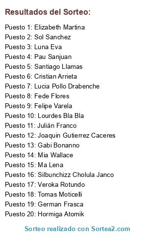 Lista de participantes: Mia Wallace, Ma Lena, Joaquin Gutierrez Caceres, Tomas Moticelli, Silbunchizz Cholula Janco, Felipe Varela, Sol Sanchez, Julián Franco, Fede Flores, Lourdes Bla Bla, Luna Eva, Cristian Arrieta, Elizabeth Martina, Lucia Pollo Drabenche, Hormiga Atomik, Gabi Bonanno, German Frasca, Santiago Llamas, Pau Sanjuan, Veroka Rotundo.
