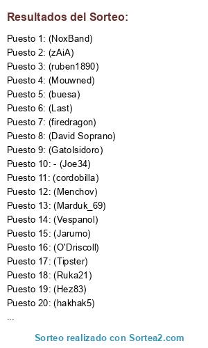 Lista de participantes: (Ruka21), (Mouwned), (toni_v13), (Tipster), (firedragon), (ruben1890), (NoxBand), (GatoIsidoro), (buesa), (O'Driscoll), (Vespanol), (David Soprano), (hakhak5), (Menchov), (Last), (zAiA), - (Joe34), (cordobilla), (Marduk_69), (Hez83), (Jarumo).