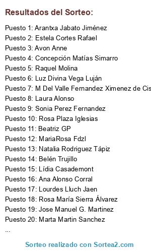 Lista de participantes: Milagros Lopez Ramirez, Lydia Rodriguez Calle, Enkar Benito, Leire Mateos Nogales, Mariposas en Mis Sueños, Prado Miguelez(2 participaciones), Tamar Gt, Laura Alonso(2 participaciones), Ina García, Rosa Plaza Iglesias, Eva Garcia, Rosa María Sierra Álvarez (2 participaciones), Mirian Ortiz, Concepción Matías Simarro, Luisa Franco Gomez, Natalia Rodriguez Tápiz, ¿Dónde HAY sorteos? (2 participaciones), Agueda Ramos Alvarez (2 participaciones), Marta Martin Sanchez, Avon Anne, Pilar Gil Costa, Feli Gea Pérez, Sonia Castro Gonzalez, Lourdes Lluch Jaen, Carmen Contreras, Myriam Riquelme López, Flor BG, Ana Alonso Corral, Manuela Llamas Martinez, Noelia CR, Belen Ruiz Rodriguez, Arantxa Jabato Jiménez, Carmen García Magadan (2 participaciones), Luz Divina Vega Luján, Anita Arias, Belén Trujillo, Pascual E Puri, M Del Valle Fernandez Ximenez de Cisneros, Lola Contreras, Mari Carmen Asins Royo, Aroa Pérez Arciniega, Garcia Ruiz Maribel (2 participaciones), Estefania Lara Leon, Loli Simon, Beatriz GP, Montse Sousa, Luisa Dionisio, MariaRosa Fdzl, Noelia Angulo, Maica Fernandez, Estela Cortes Rafael, ana luisa martin (2 participaciones), Lídia Casademont, Sonia Perez Fernandez, Vanesa Montes Nuñez, Pilar Pinto, Raquel Molina, Maribel Jimenez Lobo, Lourdes Bertran Rodenas, Noemi Entierre, Mercedes Puertas, Jose Manuel G. Martinez.