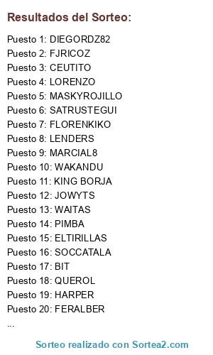Lista de participantes: VALENCIA - FLORENKIKO, CHELSEA - LENDERS, JUVENTUS - SATRUSTEGUI, BARCELONA - SHEIFOR, ARSENAL - HAPPYORDONEZ, MALAGA - FERALBER, CADIZ - JOWYTS, VILLARREAL - WAKANDU, MANCHESTER U. - DIEGORDZ82, AJAX - FJRICOZ, FLAMENGO - SOCCATALA, CELTIC - BIT, BAYERN - SR OSQUITAR, OSASUNA - MASKYROJILLO, GALATASARAY - ANGEL MORENO, MANCHESTER C. - PIMBA, ASTON VILLA - GUANCHU, PSG - CEUTITO, GRANADA - LMGR1989, R. SOCIEDAD - ELTIRILLAS, INTER DE MILAN - SIMARRO, AT. MADRID - HARPER, MADRID - D5P5R5, SEVILLA - NYZANES.