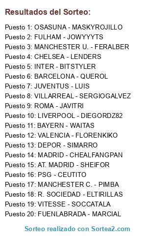 Lista de participantes: CHELSEA - LENDERS, BENFICA - DIEGORDZ82, LIVERPOOL - KASEO CREW, BARCELONA - QUEROL, SPORT BOYS - AFRESCOFER, AT. MADRID - SHEIFOR, AJAX - SOCCATALA, VILLARREAL - S.GALVEZ, FULHAM - JOWYYYTS, LAS PALMAS - IMPARABLE, OSASUNA - MASKYROJILLO, JUVENTUS - LUIS77, MANCHESTER - FERALBER, BAYERN - WAITAS, ROMA - JAVITRI, INTER - BITSTYLER, U. ESPAÑOLA - MAKAROOV, PSG - CEUTITO, CADIZ - MIGUELMG, DEPOR - PEP.