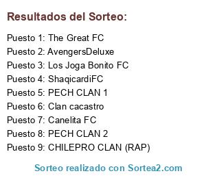 Lista de participantes: ShaqicardiFC, AvengersDeluxe, PECH CLAN 1, PECH CLAN 2, CHILEPRO CLAN (RAP), Canelita FC, The Great FC, Los Joga Bonito FC, Clan cacastro.