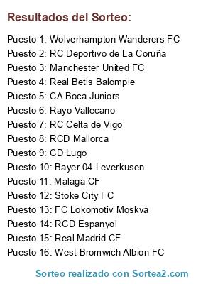 Lista de participantes: CA Boca Juniors, Wolverhampton Wanderers FC, Real Betis Balompie, RC Deportivo de La Coruña, RCD Mallorca, Manchester United FC, RC Celta de Vigo, Bayer 04 Leverkusen, Real Madrid CF, RCD Espanyol, FC Lokomotiv Moskva, CD Lugo, Rayo Vallecano, Malaga CF, West Bromwich Albion FC, Stoke City FC.