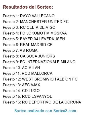 Lista de participantes: BAYER 04 LEVERKUSEN, AS ROMA, AFC AJAX, FC LOKOMOTIV MOSKVA, MANCHESTER UNITED FC, RAYO VALLECANO, WEST BROMWICH ALBION FC, RC CELTA DE VIGO, CA BOCA JUNIORS, CD LUGO, REAL MADRID CF, RC DEPORTIVO DE LA CORUÑA, RCD ESPANYOL, RCD MALLORCA, AC MILAN, FC INTERNAZIONALE MILANO.