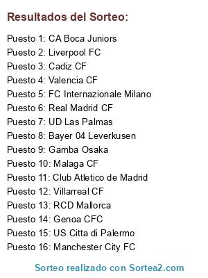 Lista de participantes: CA Boca Juniors, Gamba Osaka, FC Internazionale Milano, US Citta di Palermo, RCD Mallorca, Liverpool FC, Villarreal CF, Bayer 04 Leverkusen, Real Madrid CF, Manchester City FC, Valencia CF, UD Las Palmas, Genoa CFC, Malaga CF, Cadiz CF, Club Atletico de Madrid.