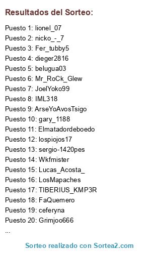 Lista de participantes: TIBERIUS_KMP3R, Mr_RoCk_Glew, JoelYoko99, FaQuemero, Grimjoo666, Argentincho, gary_1188, lionel_07, dieger2816, IML318, ceferyna, Fer_tubby5, ArseYoAvosTsigo, Elmatadordeboedo, nicko_-_7, LosMapaches, sergio-1420pes, Wkfmister, Lucas_Acosta_, arielhernan, piruloide130482, belugua03, Seba1977ar, lospiojos17.