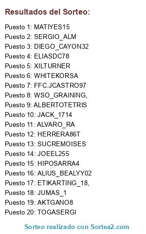Lista de participantes: XILTURNER, ALIUS_BEALYY02, DIEGO_CAYON32, ETIKARTING_18,, WSO_GRAINING,, WHITEKORSA, JOEEL255, HERRERA86T, JUMAS_1, ALVARO_RA, ALBERTOTETRIS, TOGASERGI, SERGIO_ALM, MATIYES15, FFC.JCASTRO97, ELIASDC78, HIPOSARRA4, SUCREMOISES, AKTGANO8, JACK_1714.