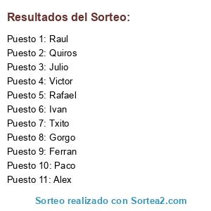 Lista de participantes: Alex, Ferran, Txito, Raul, Paco, Quiros, Ivan, Rafael, Julio, Gorgo, Victor.