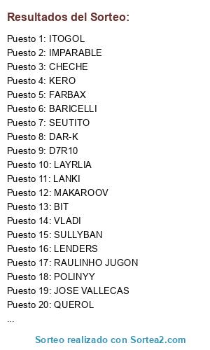Lista de participantes: CHECHE, LENDERS, ADELVAL, POLINYY, FARBAX, RAULINHO JUGON, LANKI, SULLYBAN, MAKAROOV, BARICELLI, ITOGOL, IMPARABLE, JOSE VALLECAS, D7R10, KERO, AKTGANO, CERVELAMAN, LAYRLIA, SEUTITO, BIT, RAFAE, CALVOTAINAS, QUEROL, VLADI, DAR-K, MERCUXO.