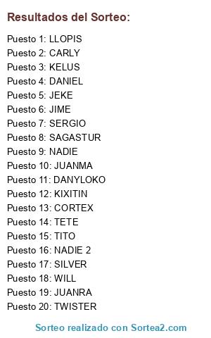 Lista de participantes: JEKE, KELUS, TETE, SILVER, LLOPIS, CARLY, CORTEX, WILL, DANYLOKO, DANIEL, SERGIO, JUANRA, JUANMA, JIME, KIXITIN, SAGASTUR, TITO, TWISTER, NADIE, NADIE 2.
