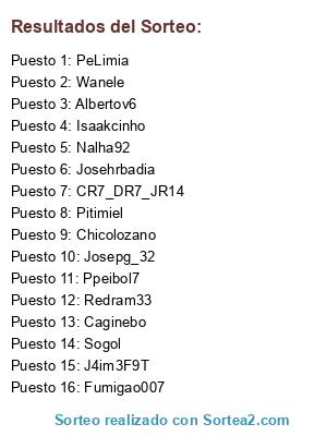 Lista de participantes: J4im3F9T, Sogol, Caginebo, CR7_DR7_JR14, Nalha92, Pitimiel, Chicolozano, Wanele, Isaakcinho, Josepg_32, Redram33, Josehrbadia, Ppeibol7, Fumigao007, Albertov6, PeLimia.