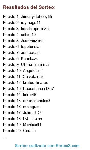 Lista de participantes: JRIKY, kratos_linares, Montixx94, aemepoam, DJ__Luian, Ultimatejuanma, NisteR_69, rubenss81, topotencia, Calvotainas, LUISKAYAZA, Julio_RD7, lalillo46, D_labarbacoa7_, sefis_10, guanchu, barroso_ceuta, Kamikaze, reymago11, Ceutito, honda_ipr_civic, Jimenystelrooy85, Fabiomurcia1987, Miguel_Fdez_97, JuanmaZero, empresariales3, Angelete_7, malagueo.