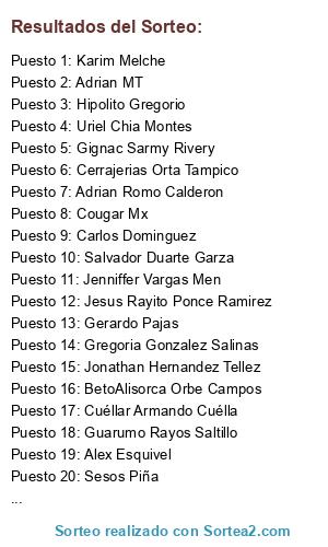 Lista de participantes: Diana Perez Gamboa, Eder Esteban Rios, Lourdes Islas Patricio, Katya Hernandez Davalos, Oved Islas Monroy, Esdras Oved Tolentino, Juan Carlos Lerma García, Adrian Romo Calderon , Miguel Perez , Israel Ramirez Mendieta , Eristeo Martinez Beltran , Daniel Mrz, Luis Enrique Carranza Perez , Miku Miku , Guarumo Rayos Saltillo , Alexandro Silvan Grela , Arthur Ortiz , Gregoria Gonzalez Salinas, Angela Monroy Monroy, Adrian Alvarado Monroy, Juan Gonzalez Salinas, Pedro Santamaria , Cesar Hurtado Valenzuela , Raul Piña , Rafa Rayo Martinez y, Pandita Heberayo Sanchez, Sesos Piña, Gignac Sarmy Rivery , Ricardo Rangel Beltran , Giovanni Sanchez, Aguilar Ramón, Peter Aranda , Marco Antonio Pineda Nicolas , Salvador Duarte Garza , Alfredo Aguirre Arano , Alex Esquivel, Juan Carlos Solis Floriano , Juan Jose Zuñiga Lopez , Eliel Mendoza Cuvas, Antonio Andrade Segovia, Itzel Chavez , Cerrajerias Orta Tampico, Abel Gonzales , Haydee Ortiz , Natali Monroy Monroy, Jesus Rayito Ponce Ramirez, Mauro Castellanos, Carlos Eduardo Barrios , Gerardo Pajas , Esteban Monter Garcia, Hernandez Alex, Vianel Rojas Gerardo , Cuéllar Armando Cuélla, Gilberto Gutiérrez , Pablo Juventino Gregorio Garcia, David Rosas Delgado , Samuel Barrios Goonzalez, Hipolito Gregorio , Insecto De Rayos Navarro , Checo Arenas , Kaska Ska , Juancho Juanelo , Mario Ncx Ags , Pancho Velazquez , David Solano, Alexis Morales , Victor Martinez M, Victor Suarez , Olivia Monroy Fernandez, Luis Roman Lopez Palacios, Carlos Dominguez, Sergio Eduardo De La Cruz Moreno , Uriel Chia Montes, Adrian MT, Enrique Vázquez Malpica , Antonio Aparicio Diaz , Felipe Navarrete , Juan Carlos Guzman Sanchez, Jorge Casas Cienfuegos, BetoAlisorca Orbe Campos, Rene Alonso Vasquez, Alma Rojiblanco Nkaxista , Francisco Joel Morales Ruiz, Mariano Licon Gro, Karim Melche, Hidrorayo Arcos y, Edgardo Toleninto Tellez, Jonathan Hernandez Tellez, Alex Arturo Patricioo, Paty Presbitero , Christopher Pedraza Gomez, Luis Ignacio Ruiz Ramirez , Angélica Castro de Ch, Jenniffer Vargas Men, Hidró Esquivel , Hector Ricardo Reyes Flores , Cougar Mx , Jose Luis Heredia Fernandez, Victhor Rocha , Jasson Acea , Ramón Ortiz.