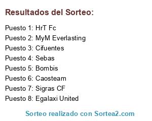 Lista de participantes: Sigras CF, HrT Fc, Bombis, Cifuentes, MyM Everlasting, Egalaxi United, Caosteam, Sebas.
