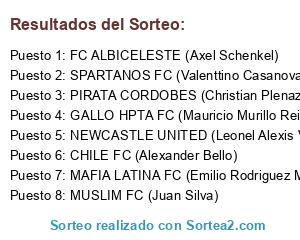 Lista de participantes: PIRATA CORDOBES (Christian Plenazzio), NEWCASTLE UNITED (Leonel Alexis Vargas), FC ALBICELESTE (Axel Schenkel), SPARTANOS FC (Valenttino Casanova), MUSLIM FC (Juan Silva), GALLO HPTA FC (Mauricio Murillo Reina), MAFIA LATINA FC (Emilio Rodriguez Morales), CHILE FC (Alexander Bello).