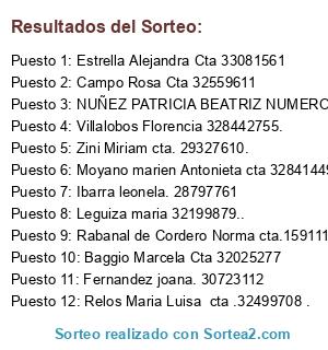 Lista de participantes: Aguero gisel. 33086660, Agustina Fernández 32739571, Aldecua alicia 22020048, Ángeles Lopez 32740413, Antonio Salcedo Cta 32195873, Aveiro de Mosca Sara cta. 8257590., Baggio Marcela Cta 32025277, Campo Rosa Cta 32559611, Campos teresa. 30352742, Cardozo Patricia analia cta 10418178, Carrizo mayra 35503136, Colucci Elba Cta 2055287, Cruz mariana. 33083351, Dominguez noelia paola 33147341.., Escudero Silvia Cta32402151, Estrella Alejandra Cta 33081561, Fernandez estefania magali 33085494.., Fernandez joana. 30723112, Ferreira Cristina Cta 32196179, Ferrer Silvana Cta 29293929, Flores ana Mercedes cta 33186592, flores Belén 32962122., Giovanna Maribel anahue 33084676., Gonzalez carolina 31349176, Huarachi elizabeth 33186495., Ibarra leonela. 28797761, Leguiza maria 32199879.., Lell Josefina Cta 30808061, López fany Cta 14675434, Martinez marta Estela 25879066, Moyano marien Antonieta cta 32841449, NUÑEZ PATRICIA BEATRIZ NUMERO de cuenta 30503570, Olivera Marta 3290089., QUIROGA SUSANA LORENA 29012903, Rabanal de Cordero Norma cta.15911158 ., Redondo Delia Cta 9715614, Relos Maria Luisa cta .32499708 ., Riera cinthia. 32902111, RODRIGUEZ MARIA NURIA numero de cuenta 32738036, sandoval maria emilia 33150520., singuri flavia 33150512., Velardes aldana gisela 29416451.., Villalobos Florencia 328442755., Zini Miriam cta. 29327610..