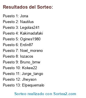 Lista de participantes: Kakimadafaki, Jorge_tango, Jona, Legolas241, Elpequemalo, Nautilus, Erdin87, Iozacos, Jheyson, Ogines1980, Bruno_bmw, Noel_moreno, Kokee22.