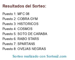 Lista de participantes: COSMOS, COBRA GYM, MFC 08, HISTORICOS, RABO STARS, SOTO DE CARABA, OVEJAS NEGRAS, SPARTANS.