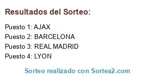 Lista de participantes: LYON, BARCELONA, AJAX, REAL MADRID.