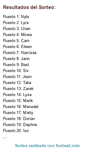 Lista de participantes: Siv, Nyla, Iso, Mireia, Atticus, Dorian, Eileen, Zarek, Bast, Lysa, Aisha, Cam, Daphne, Jano, Jean, Urian, Menadel, Lyra, Merik, Narcissa, Rai, Matty, Derain, Talia.