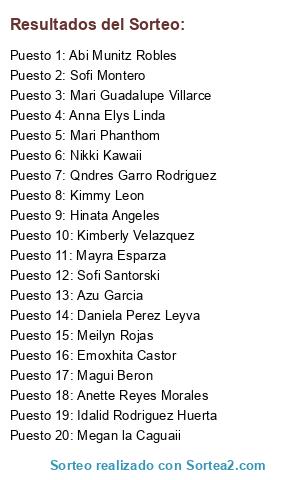 Lista de participantes: Megan la Caguaii, Daniela Perez Leyva(2 participaciones), Idalid Rodriguez Huerta(3 participaciones), Sofi Santorski(4 participaciones), Anette Reyes Morales(5 participaciones), Kimberly Velazquez(6 participaciones), Magui Beron(7 participaciones), Meilyn Rojas(8 participaciones), Emoxhita Castor(9 participaciones), Azu Garcia(10 participaciones), Mayra Esparza(11 participaciones), Nikki Kawaii(12 participaciones), Mari Guadalupe Villarce(13 participaciones), Abi Munitz Robles(14 participaciones), Kimmy Leon(15 participaciones), Mari Phanthom(16 participaciones), Hinata Angeles(17 participaciones), Sofi Montero(18 participaciones), Qndres Garro Rodriguez(19 participaciones), Anna Elys Linda(20 participaciones).