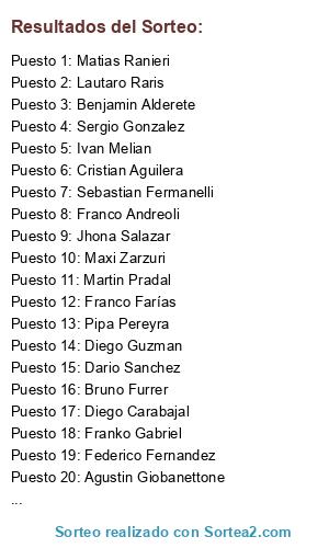 Lista de participantes: Cristian Aguilera, Emiliano Patineta, Matias Rios, Juan Grasso, Maximiliano Hernandez, Franco Farías, Sebastian Fermanelli, Federico Fernandez, Ruben Ledesma, Augusto Gonzalez, Martin Pradal, Pipa Pereyra, Diego Ramos Lamas, Gabriel Britez, Cristian Zarzuri, German Bella Barral, Roman Evangelista, Jhona Salazar, Marcelo Ayala, Junior Zabala, Nazareno Regueira, Benjamin Alderete, Martin Gomez, Renzo Acosta, Dario Sanchez, Matias Ranieri, Fernando Pereira, Ivan Melian, Diego Guzman, Tomas Martinez, Sergio Gonzalez, Diego Carabajal, Tobias Martinez, Tomas Fernandez, Bruno Furrer, Franco Andreoli, Agustin Giobanettone, Lautaro Raris, Maxi Zarzuri, Franko Gabriel.