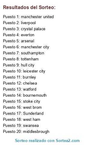 Lista de participantes: manchester city, arsenal, tottenham, liverpool, everton, chelsea, manchester united, southampton, crystal palace, watford, bournemouth, west brom, leicester city, burnley, west ham, hull city, middlesbrough, stoke city, swansea, Sunderland.