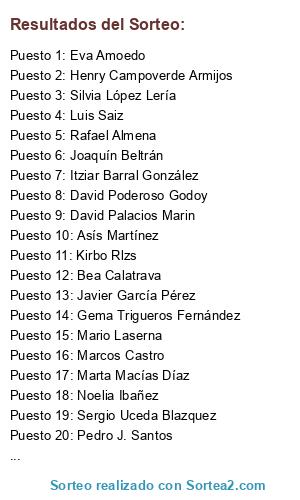 Lista de participantes: Viki Viana Colino, MariaJo Gomez, David Moreno, Itziar Barral González, Enrique Cabrera, Eva Amoedo, Kalea Eginko, Pedro J. Santos, Manu Jordan, Marcos Castro, Csa Fe Vill, Mimi Merino, Kirbo Rlzs, Joaquín Beltrán, Barbara Quijada, Míriam Pareja, Manoli Montarroso, José Antonio Gómez Rodríguez, Marceluro Përez Reverde, Cristina Perez, Omar Andújar Herrera, Javier García Pérez, Javier Martín, Tania Faedo, Guillermo Fabregat, Dani Granada, Lola Rodriguez, Alba Pérez Núñez, Roberto Jaime Martinez, David Manero Martin, Marta Macías Díaz, Dra Zahoib, Henry Campoverde Armijos, Patricia Diego Pardo, Rafael Moreno Villalba, Rafael Almena, Antoni Parera Ubach, Miguel Lorenzo, Noelia Ibañez, Sergio Carrillo, Valeria Monar Martínez, David Poderoso Godoy, Mercedes Fernandez, Concepcion Martin Jimenez, Asís Martínez, David Palacios Marin, Jasebe Garcia, Josu Sanchez, Edu Quintana, Carlos Lopez, Isabel Vargas, Laura Terrón Menoyo, Núria Barroso, Richard IS, Jonathan Ruf, Angel Martinez Mateo, Francisca Heredia Perez, Bea Calatrava, Gema Trigueros Fernández, Gabriela Zafra Arauzo, Jorge EB, Mario Sierra, Sergio Uceda Blazquez, Beatriz Olivares Gomez, Luis Saiz, Mario Laserna, Raúl de la Torre, Marta Perez Revuelta, Olga Ubeda, Francisco Javier Muñoz Marcos, Silvia López Lería, Raúl Pérez García.