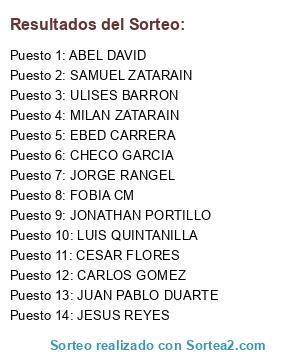 Lista de participantes: JESUS REYES, CHECO GARCIA, CARLOS GOMEZ, EBED CARRERA, ANGEL FDZ, WILLIAM CORVALAN, CESAR FLORES, ANGEL DURAN, DAVID URIBE, FRANK MEJIA, JARED REYNOSO, JORGE RANGEL, JONATHAN PORTILLO, JUAN DUARTE.