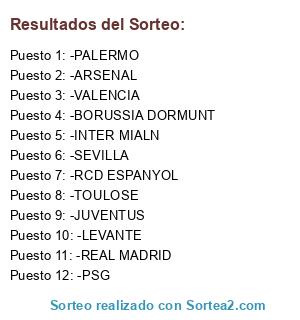 Lista de participantes: -SEVILLA, -BORUSSIA DORMUNT, -LEVANTE, -JUVENTUS, -PALERMO, -REAL MADRID, -PSG, -VALENCIA, -INTER MIALN, -RCD ESPANYOL, -ARSENAL, -TOULOSE.