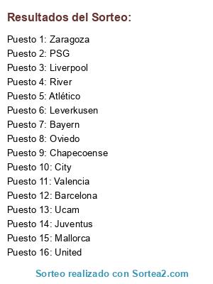 Lista de participantes: Celta, Inter, Deportivo, Villarreal, Cádiz, United, Betis, Bayern, City, Bilbao, Leverkusen, UCAM, Juventus, PSG, ATM, Barcelona.