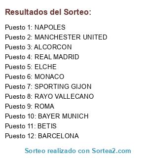 Lista de participantes: BETIS, SPORTING GIJON, MONACO, NAPOLES, BARCELONA, REAL MADRID, MANCHESTER UNITED, BAYER MUNICH, ALCORCON, ROMA, RAYO VALLECANO, ELCHE.