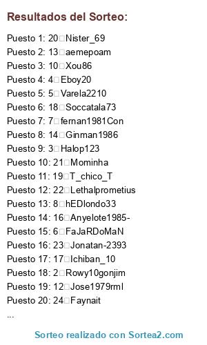 Lista de participantes: 1 JesuML, 2 Rowy10gonjim, 3 Halop123, 4 Eboy20, 5 Varela2210, 6 FaJaRDoMaN, 7 fernan1981Con, 8 hEDlondo33, 9 Xchiky3x, 10 Xou86, 11 Jjose84, 12 Jose1979rml, 13 aemepoam, 14 Ginman1986, 15 Ansale86, 16 Anyelote1985-, 17 Ichiban_10, 18 Soccatala73, 19 T_chico_T, 20 Nister_69, 21 Mominha, 22 Lethalprometius, 23 Jonatan-2393, 24 Faynait.