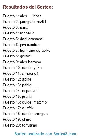 Lista de participantes: to fuamo, chino, dani mytiko, alex___boss, roche12, juanki, alex barroso, hermano de apike, dani merengue, pablo, juangutierrez91, dani granada, quiqe_maximo, simeone1, espaduki, javi cuadrao, a_sfdk, isma, golitof, apike.