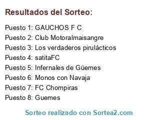 Lista de participantes: Los verdaderos pirulácticos, FC Chompiras, Guemes, Monos con Navaja, satitaFC, Club Motoralmaisangre, Infernales de Güemes, GAUCHOS F C.
