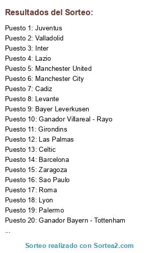 Lista de participantes: Ganador Villareal - Rayo, Ganador Bayern - Tottenham, Bayer Leverkusen, Juventus, Palermo, Inter, Lazio, Lyon, PSG, Cadiz, Atlético de Madrid, Manchester City, Sao Paulo, Anderlecht, Barcelona, Manchester United, Real Sociedad, Espanyol, Parma, Levante, Celtic, Deportivo, Zaragoza, Valladolid, PSV, Chelsea, Girondins, Valencia, Racing de Santander, Real Madrid, Roma, Las Palmas.