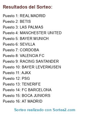 Lista de participantes: MANCHESTER UNITED, BAYER MUNICH, BETIS, BAYER LEVERKUSEN, RACING SANTANDER, PSG, REAL MADRID, SEVILLA, FC BARCELONA, VALENCIA FC, CORDOBA, AJAX, BOCA JUNIORS, AT MADRID, LAS PALMAS, TENERIFE.