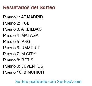 Lista de participantes: FCB, RMADRID, JUVENTUS, M.CITY, MALAGA, B.MUNICH, AT.BILBAO, PSG, AT.MADRID, BETIS.