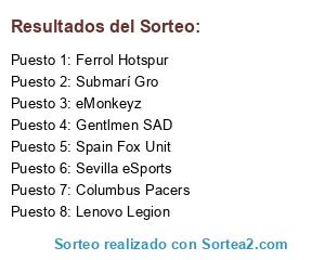 Lista de participantes: Submarí Gro, Lenovo Legion, Ferrol Hotspur, Columbus Pacers, Gentlmen SAD, Spain Fox Unit, Sevilla eSports, eMonkeyz.