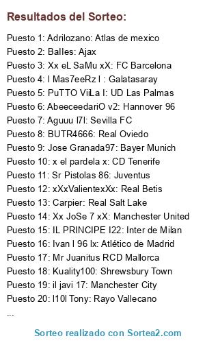 Lista de participantes: l10l Tony: Rayo Vallecano, Panterjack: Villareal, il javi 17: Manchester City, Adrilozano: Atlas de mexico, Mr Juanitus RCD Mallorca, Jorchebopa: Levante UD, Sr Pistolas 86: Juventus, xXxValientexXx: Real Betis, Aguuu l7l: Sevilla FC, BaIIes: Ajax, l Mas7eeRz l : Galatasaray, CarlosBD9: Celtic de Glasgow, eSencial alpiNo : AS Roma, Xx eL SaMu xX: FC Barcelona, Jimmy Baek: Borussia Dortmund, Juanfran333: Malaga CF, IL PRINCIPE I22: Inter de Milan, zZzZ JONA zZzZ: Totteham, Ivan l 96 lx: Atlético de Madrid, AbeeceedariO v2: Hannover 96, x el pardela x: CD Tenerife, Jose Granada97: Bayer Munich, PuTTO ViiLa I: UD Las Palmas, Kuality100: Shrewsbury Town, Xx JoSe 7 xX: Manchester United, Xx KeNstaLL xX: Celta de Vigo, Andrew Torre: Real Sociedad, El Renegado95: Hamburgo, Carpier: Real Salt Lake, BUTR4666: Real Oviedo, Capo Canoneri: UD Almería, BestElTopillo: New York City.