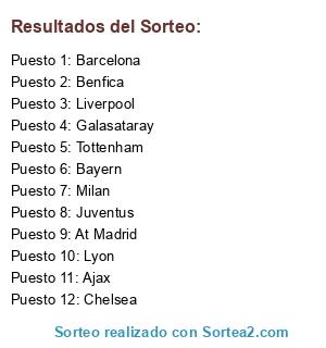 Lista de participantes: Milan, Juventus, Barcelona, Bayern, Chelsea, Liverpool, At Madrid, Tottenham, Lyon, Galasataray, Benfica, Ajax.