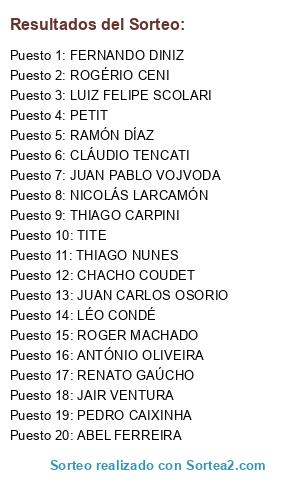 Lista de participantes: JAIR VENTURA, LUIZ FELIPE SCOLARI, JUAN CARLOS OSORIO, ROGÉRIO CENI, THIAGO NUNES, PEDRO CAIXINHA, NICOLÁS LARCAMÓN, ANTÓNIO OLIVEIRA, CLÁUDIO TENCATI, PETIT, TITE, FERNANDO DINIZ, JUAN PABLO VOJVODA, RENATO GAÚCHO, CHACHO COUDET, ROGER MACHADO, ABEL FERREIRA, THIAGO CARPINI, RAMÓN DÍAZ, LÉO CONDÉ.