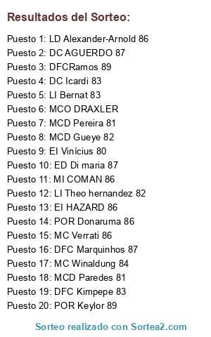 Lista de participantes: PSG Michy Batshuayi, PSG Kevin Trapp, PSG Jose Angel Pozo, PSG Javier Pastore, PSG David Luiz, PSG Omer Toprak, PSG Alex Telles, PSG Timo Horn, PSG Alexis Sánchez, PSG Luiz Gustavo, PSG Serger Aurier, PSG Lionel Messi, PSG Diego Godin, PSG Ignacio Camacho.