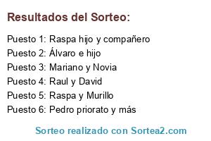 Lista de participantes: Raul y David, Raspa y Murillo, Álvaro e hijo, Raspa hijo y compañero, Pedro priorato y más, Mariano y Novia.
